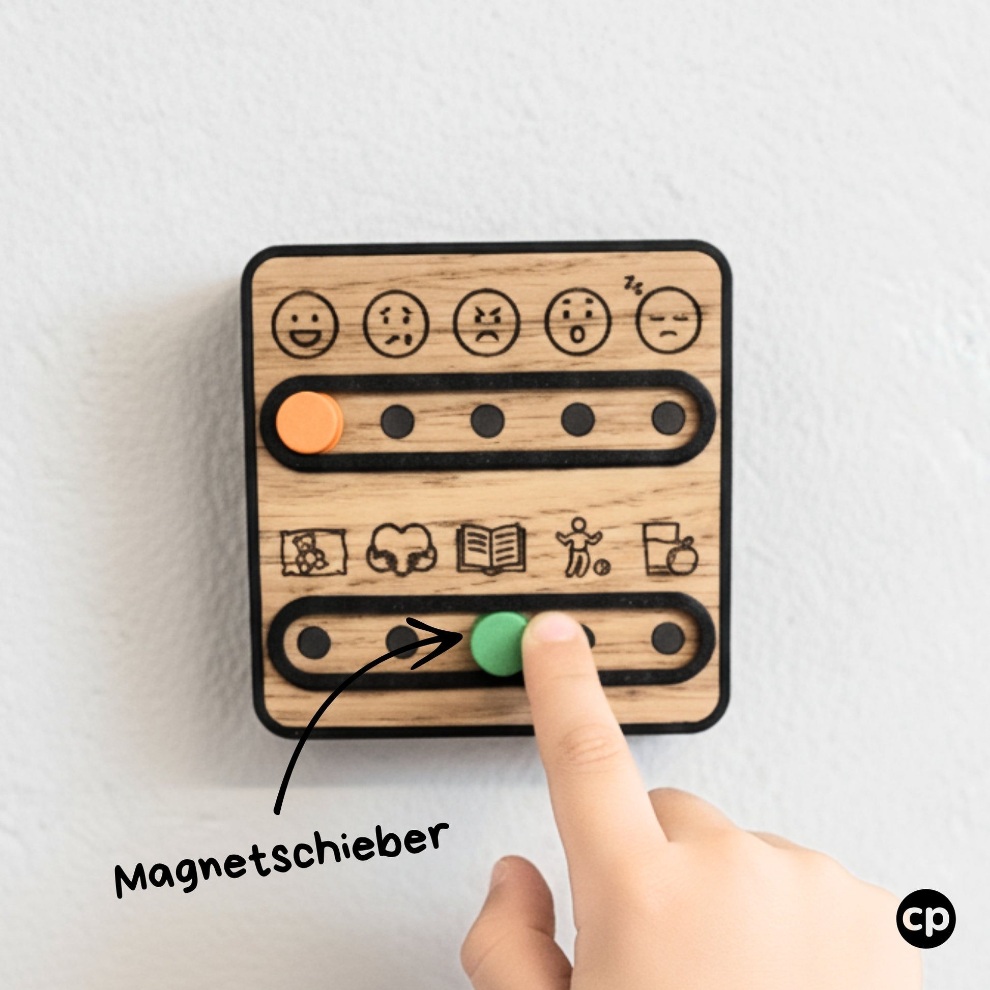 Mit dem clicpit EMOTION behalten Kinder ihre Gefühle und Bedürfnisse spielerisch im Blick. Auf der oberen Reihe zeigt der orange Magnetschieber, der an der gewünschten Position magnetisch hält, das aktuelle emotionale Wohlbefinden – von glücklich über müde bis hin zu traurig.