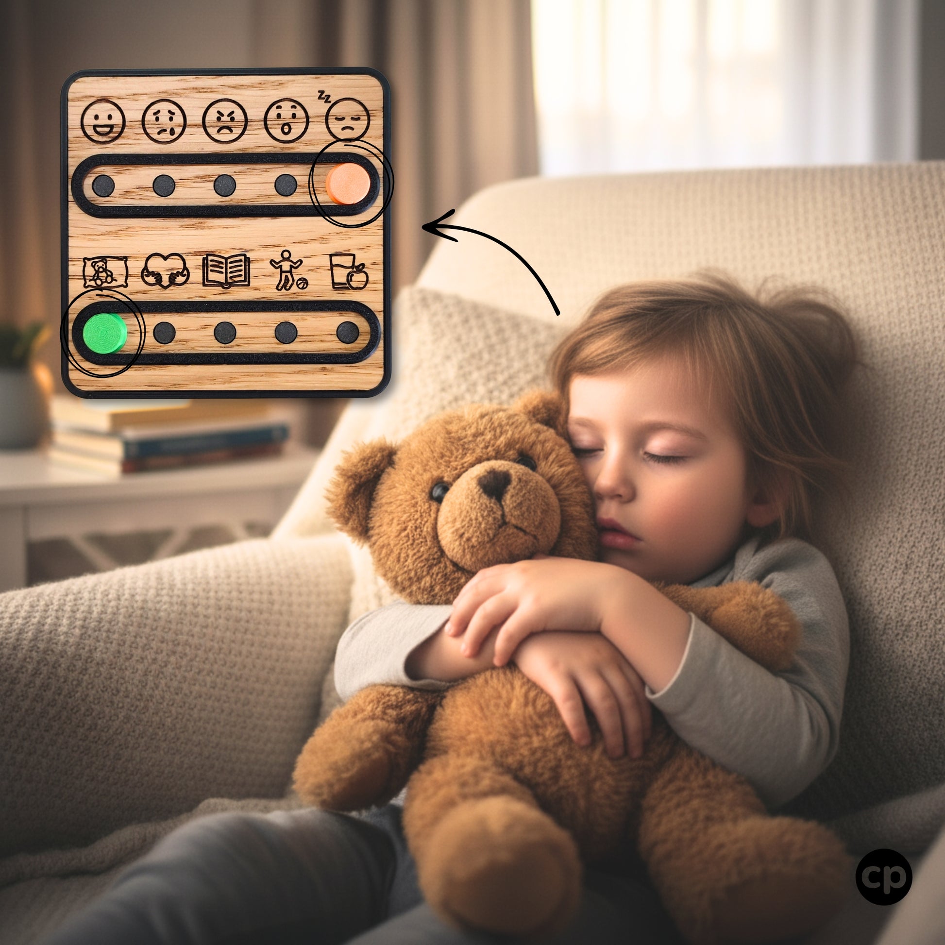 Auf der unteren Reihe können Kinder ihre Bedürfnisse einstellen. Fünf liebevoll gestaltete Symbole (Müde, Umarmung, Buch anschauen oder lesen, nach draussen gehen, etwas essen) helfen ihnen, auszudrücken, was sie gerade brauchen.